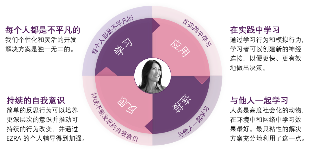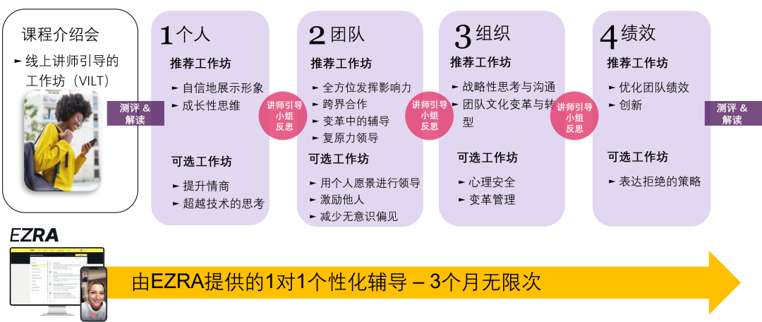 为了帮助中层管理人员发展个人领导力同时实现业务目标,我们设计了一个学习旅程,确保该学习旅程为参与者提供了学习、应用、联系和反思的环节,并与其的实际工作场景相链接。
